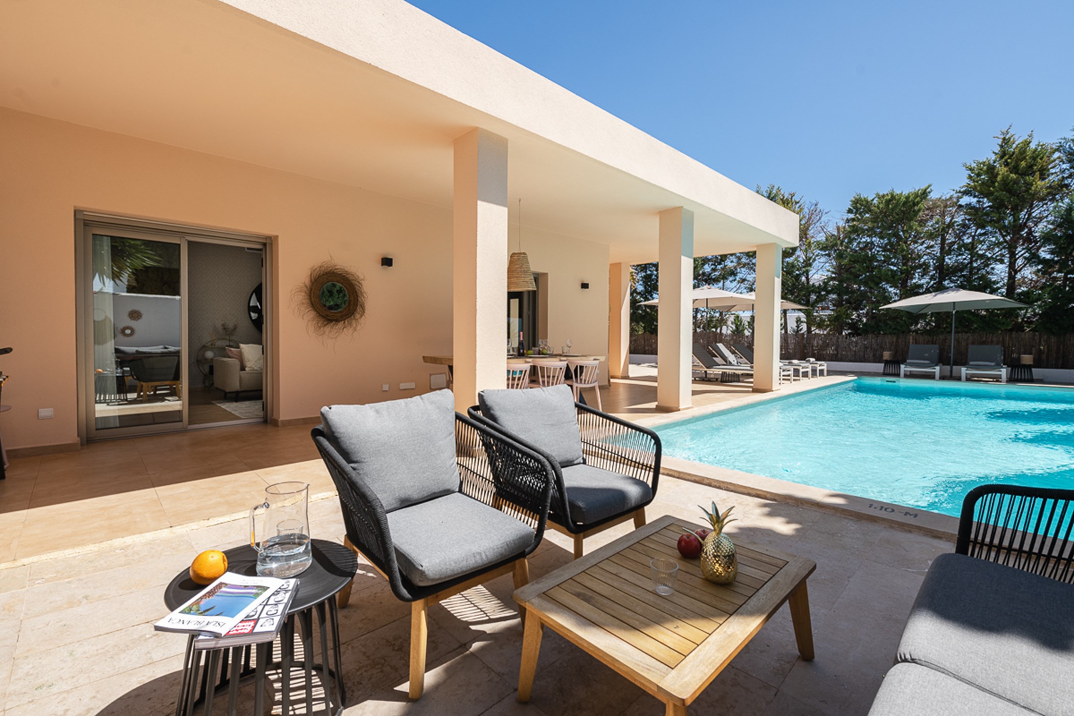 Alongside the interior dining table, creamy upholstery and an open fireplace create a cozy living space that feels generously spacious for a villa of this size.