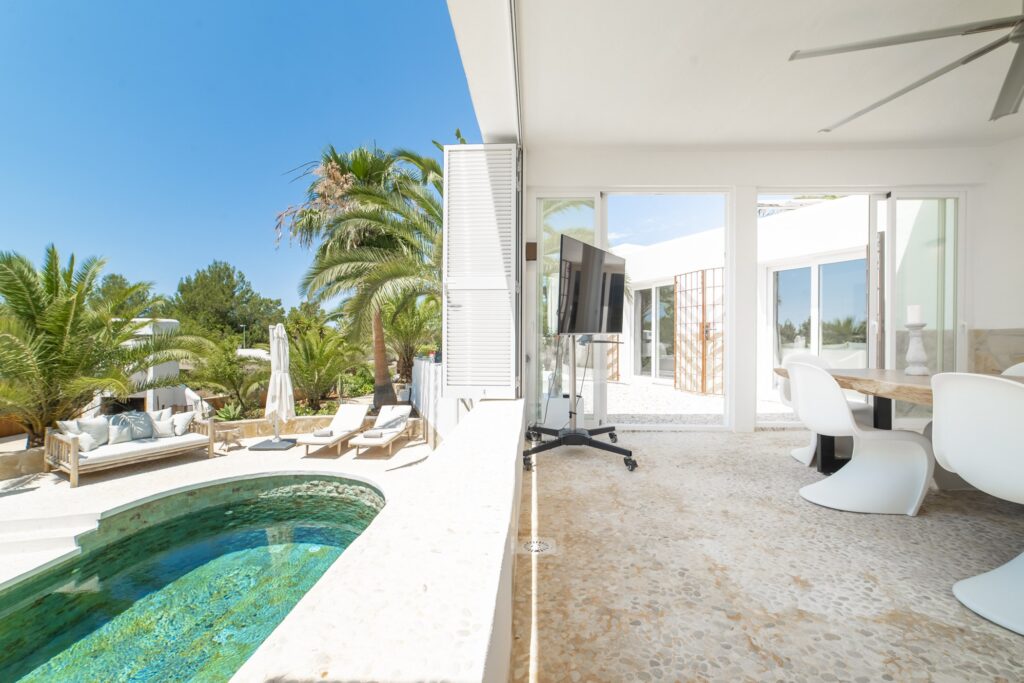 Can Beth es una impresionante villa de 4 habitaciones, idealmente situada entre el encantador pueblo de Sant Josep, conocido por su vibrante cultura de cafeterías, y las playas prístinas de Cala Tarida, Cala Moli y Cala Vadella. Esta casa elegante y contemporánea ofrece amplios espacios exteriores y […]